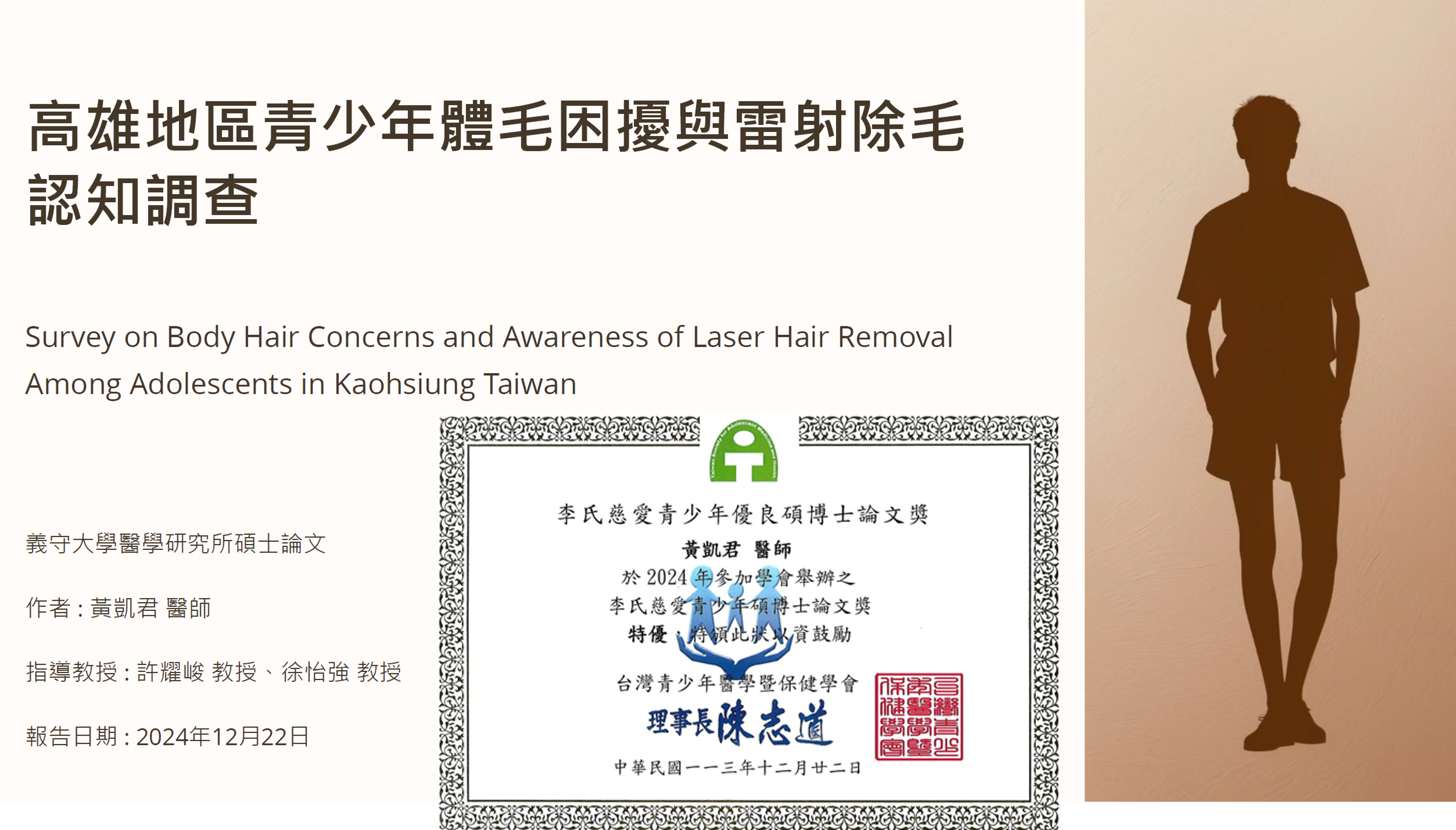 本所研究生黃凱君榮獲台灣青少年醫學暨保健學會碩博士論文獎「特優」