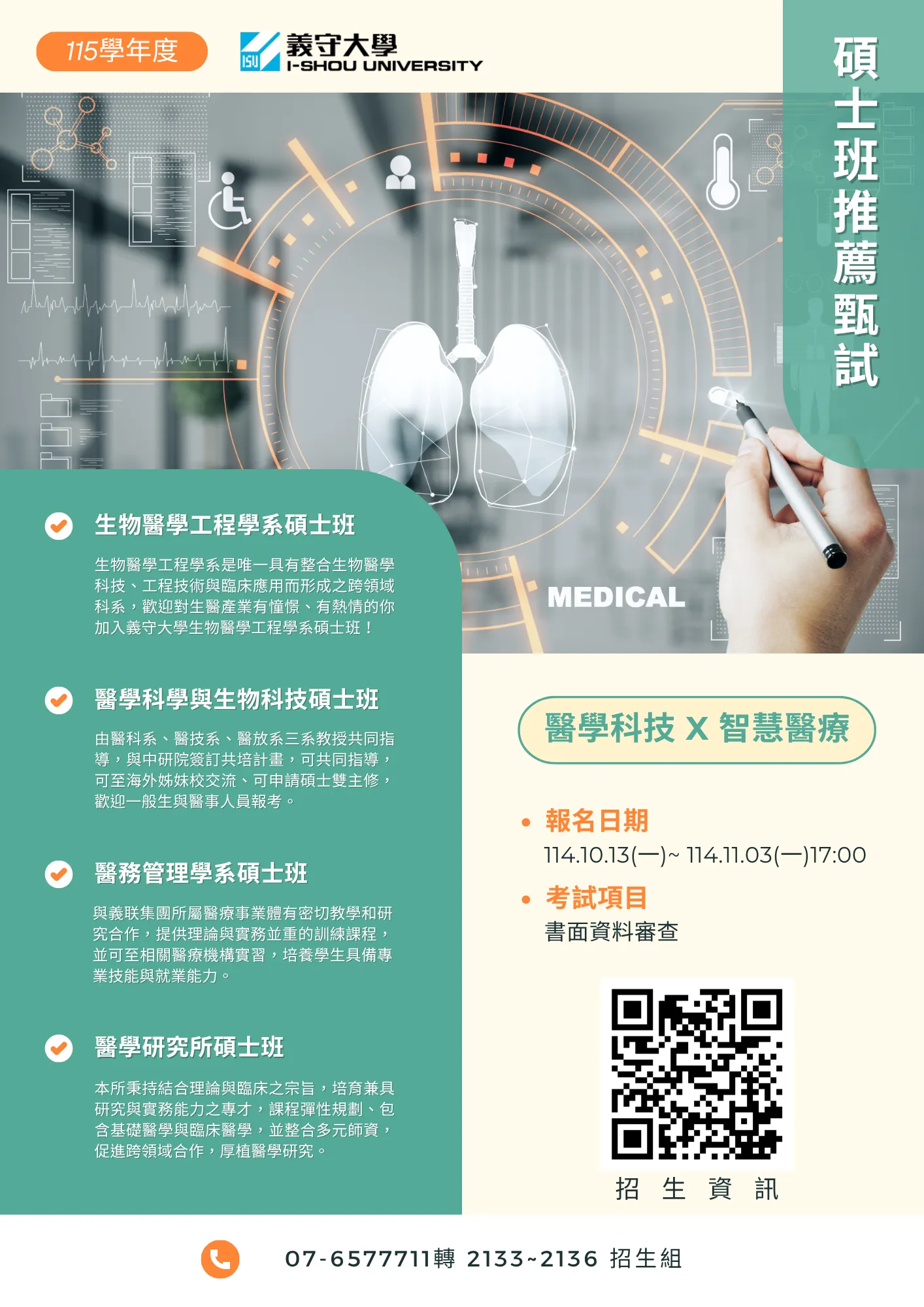 115學年度義守大學醫學研究所推薦甄試招生,報名期間自114.10.13起至114.11.03下午5點截止。